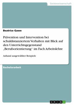 Bachelorarbeit aus dem Jahr 2010 im Fachbereich Soziale Arbeit / Sozialarbeit, Note: 2,0, Universität Potsdam (Institut für Arbeitslehre/ Technik), Sprache: Deutsch, Abstract: Die vorliegende Arbeit beschäftigt sich mit dem Thema der Schuldistanz und der sich daraus erschwerenden Arbeitsmarktsituation für die Jugendlichen in Berlin - Brandenburg. Im Verlauf konzentriert sich der Text auf die praxisorientierte Prävention und Intervention, mit der Relevanz schulischer Berufsorientierung, im Fach Arbeitslehre.