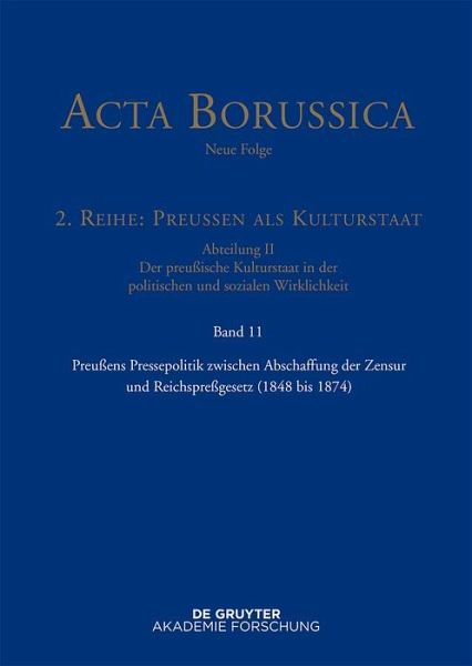Der Band dokumentiert die Pressepolitik Preußens zwischen der im März 1848 erzwungenen Aufhebung der Zensur und der gesetzlichen Regelung des Presserechts von 1874. Die Quellen zeigen die Vielgestaltigkeit der zensurfreien Presseunfreiheit dieser Jahrzehnte, die auf staatlicher Regulierung, Repression und Propaganda fusste. Zudem werden die wichtigsten zentralstaatlichen Lenkungs- und Kontrollorgane in ihrem Wirken und Personal vorgestellt.