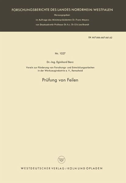 Gliederung.- I Entwicklung eines Verfahrens für die Feilleistungsprüfung zur Erzielung reproduzierbarer Meßergebnisse.- II Systematische Leistungsuntersuchungen von Feilen.