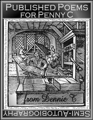 Published Poems for Penny C ('Book 1') is a collection of stories in 4 sections of fun rhyming inventory: Friendship poems in A) Social Networking Riffs; Philosophical reflections in B) Spiritual Knowledge Quest; Cultural criticisms in C) Socio-Political Shifts; and Songs of love found and lost in D) Love and Loveless. Semi-Autobiography ('Book 2') is a collection of personality sketches. 'The Books' are semi-illustrated, therefore one does not necessarily have to bore through all of the stories if they just feel like looking at pictures to see some visual glory. Readers are, additionally, encouraged to speak and otherwise verbally read the poetry as the books are intended to also provide auditory entertainment, inside and outside of the Gentle Reader's head. Please see the poem "Note," as said, "The 'printed eBook' is an illusion intended to cut through confusion with fun spiritual reading and imaginary coloring book exercises, for all Gentle Readers. The Characters may or may not, by coincidence, resemble real or imaginary youths, adults, places, objects, concepts, and leaders."