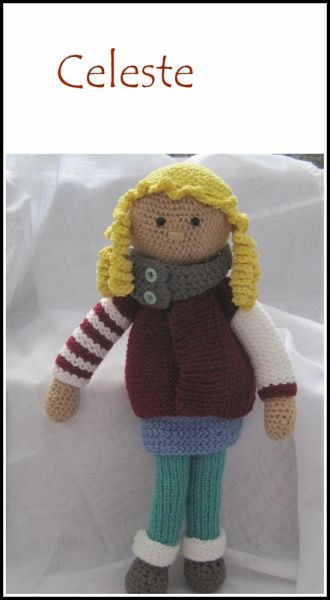 Beschreibung: Puppe Celine Diese Puppe ist ganz leicht zu häkeln, da ich jeden Schritt einzeln erkläre und es dazu eine Bildergalerie in der Anleitung gibt. Anfänger können die Anleitung sehr gut umsetzen. Kenntnisse Luftmaschen, feste Machen, Kettmaschen, halbe und ganze Stäbchen, Zunahmen, Abnahmen Die Grundtechniken für Stricken sollten vorhanden sein, weil einige Kleidungsstücke gestrickt werden. Material 30 Gramm Türkis, Weinrot, Weiß, Blau, Dunkelgrau, Hellgrau, Gelb 2 Knöpfe 50 Gramm Beige Bei der Wolle können Reste verarbeitet werden oder jedes Garn nach Wunsch eingesetzt werden. Nähnadel, Stopfnadel, Schere 2 Puppenaugen 1 cm Durchmesser Füllwatte Celine erreicht eine Größe von ca. 42 cm. Es kommt natürlich darauf an, ob eher locker oder fester gehäkelt wird. Materialien: Weiteres entnehmen Sie bitte der Anleitung