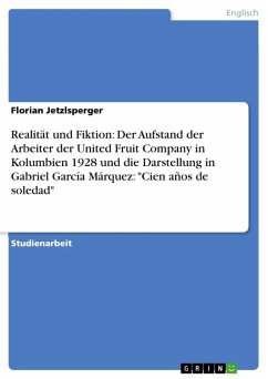 Studienarbeit aus dem Jahr 2007 im Fachbereich Amerikanistik - Literatur, Note: 1,0, Ludwig-Maximilians-Universität München (Anglistik und Amerikanistik), Veranstaltung: Hauptseminar, Sprache: Deutsch, Abstract: Die Hauptseminararbeit untersucht die Darstellung des Streiks der Bananenarbeiter der United Fruit Company und die Niederschlagung dessen durch das kolumbianische Militär in Gabriel García Márquez bekanntesten Buches "Hundert Jahre Einsamkeit". Seine fiktionale Darstellung - die für viele als wahrheitsgetreu gilt - wird mit den wahren Ereignissen des Jahres 1928 verglichen. Im Laufe der Untersuchung wird klar, dass die Darstellung Márquez' in seinem Roman übertrieben ist, tatsächlich bewirkte seine Darstellung aber überhaupt erst eine Behandlung des Themas. Die Arbeit untersucht nicht nur den Ausgang des Streiks, sondern zudem auch die Forderungen der Arbeiter, den Verlauf und die Organisation des Streiks, sowie seine unmittelbaren sozio-politischen Folgen für Arbeiter, Bevölkerung und die beiden politischen Parteien Kolumbiens. Die realen Ereignisse von 1928 werden den fiktiven Geschehnissen in "Hundert Jahre Einsamkeit" gegenübergestellt.