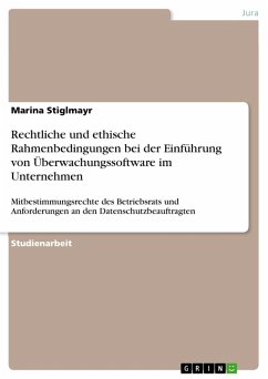 Studienarbeit aus dem Jahr 2025 im Fachbereich Jura - Datenschutz, Note: 1,7, SRH Fernhochschule, Sprache: Deutsch, Abstract: Die vorliegende Arbeit verfolgt das Ziel, die rechtlichen und ethischen Fragen zu analysieren, die sich im Zusammenhang mit der geplanten Einführung einer Überwachungssoftware zur Erfassung der E-Mail-Kommunikation im Unternehmen B stellen. Im Mittelpunkt steht die Klärung, ob und in welchem Umfang der Betriebsrat nach den einschlägigen Bestimmungen des Betriebsverfassungsgesetzes (BetrVG) beteiligt werden muss und ob das Unternehmen die gesetzliche Pflicht zur Bestellung eines Datenschutzbeauftragten (DSB) erfüllt. Darüber hinaus wird die ethische Vertretbarkeit einer möglichen Videoüberwachung am Arbeitsplatz kritisch betrachtet. Aus dieser Zielsetzung ergeben sich drei zentrale Fragestellungen: Erstens, ob und in welchem Umfang der Betriebsrat bei der Einführung der Überwachungssoftware zu beteiligen ist; zweitens, ob das Unternehmen zur Bestellung eines DSB verpflichtet ist und welche Rechte und Pflichten dabei zu beachten sind; und drittens, ob die Videoüberwachung der Mitarbeiter aus ethischer Sicht vertretbar ist. Diese Fragestellungen bilden die Grundlage für eine systematische Analyse, die sowohl rechtliche Normen als auch ethische Grundsätze berücksichtigt und daraus Handlungsempfehlungen für das Unternehmen ableitet.