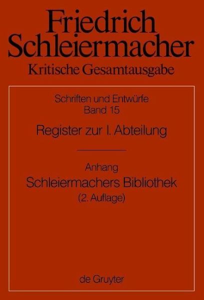 Der Registerband zur I. Abteilung "Schriften und Entwürfe" beinhaltet im ersten Kapitel ein alphabetisches und ein chronologisches Verzeichnis der hier edierten Schriften Schleiermachers sowie ein Verzeichnis der in den Bandanhängen abgedruckten Texte, sodann im zweiten Kapitel ein Namensregister der historischen und biblischen Personen, ein Register der Begriffe/Sachen und ein Register der Bibelstellen, ferner im dritten Kapitel ein Verzeichnis der von Schleiermacher benutzten Literatur und der von den Editoren angeführten Literatur. Eine Liste von Addenda und Corrigenda zur ersten Abteilung schließt sich an. Außerdem enthält der Registerband im Anhang die verbesserte Ausgabe des Verzeichnisses "Schleiermachers Bibliothek" (ersetzt Schleiermacher-Archiv Band 10).