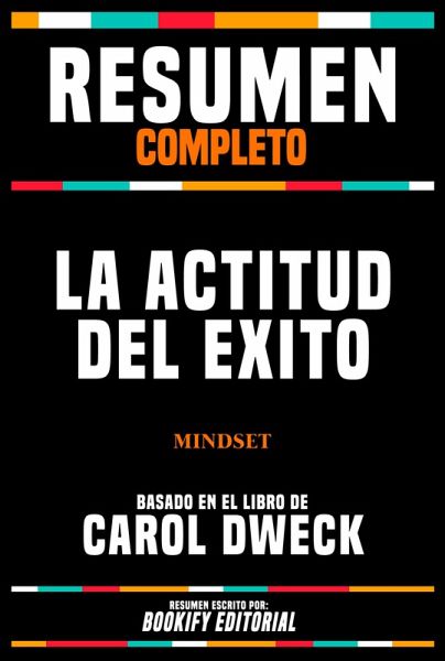 RESUMEN COMPLETO: LA ACTITUD DEL EXITO (MINDSET) - BASADO EN EL LIBRO DE CAROL DWECK RESUMEN ESCRITO POR: BOOKIFY EDITORIAL ¿Te abruma lidiar con situaciones difíciles?¿Te sientes estancado y abatido?¿Tienes miedo de enfrentar la vida? Adopta la nueva psicología del éxito, cambia de actitud y alcanzarás tus metas. ACERCA DEL LIBRO ORIGINAL:En esta obra se analizan las diferencias en la vida de las personas, diferencias que se explican por la actitud con la que se asumen las situaciones complejas. Propone un cambio de mentalidad para impulsar el éxito y la felicidad. ¿QUÉ APRENDERÁS?Conocerás estrategias y sugerencias para perfeccionarte con el objetivo de lograr tus metas.Descubrirás cómo deshacerte de tu mentalidad fija y qué hacer para adoptar una mentalidad en desarrollo, que te permitirá superar obstáculos y triunfar.Entenderás que los fracasos y las dificultades son oportunidades y desafíos para superarte a ti mismo y avanzar.Lograrás pararte frente al mundo con todos tus talentos y tus dones y alcanzarás tus metas. ACERCA DE CAROL DWECK, LA AUTORA DEL LIBRO ORIGINAL:Carol Dweck es académica en el departamento de psicología de la Universidad de Stanford. El tema central de sus investigaciones es la relación entre la motivación, la personalidad y el desarrollo. Sus conceptos sobre mentalidad fija y mentalidad en desarrollo han iluminado el campo de la superación personal. ACERCA DE BOOKIFY EDITORIAL, EL AUTOR DEL RESUMEN:LOS LIBROS SON MENTORES. Pueden guiar lo que hacemos en nuestras vidas y cómo lo hacemos. Muchos de nosotros amamos los libros mientras los leemos y hasta resuenan con nosotros algunas semanas después, pero luego de 2 años no podemos recordar si lo hemos leído o no. Y eso no está bien. Recordamos que, en el momento, aquel libro significó mucho para nosotros. ¿Por qué es que tiempo después nos hemos olvidado de todo?Este resumen toma las ideas más importantes del libro original.A muchas personas no les gusta leer, solo quieren saber qué es lo que el libro dice que deben hacer. Si confías en el autor no necesitas de los argumentos. La gran parte de los libros son argumentos de sus ideas, pero muy a menudo no necesitamos argumentos si confiamos en la fuente. Podemos entender la idea de inmediato.Toda esta información está en libro original. Este resumen hace el esfuerzo de reducir las redundancias y convertirlas en instrucciones directo al grano para las personas que no tienen intención de leer el libro en su totalidad.Esta es la misión de BOOKIFY EDITORIAL.