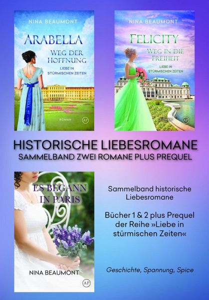 Lesen Sie die ersten zwei Bücher der historischen Reihe »Liebe in stürmischen Zeiten«, die eine fesselnde Reise quer durch das Europa des 19. Jahrhunderts bietet. Mutige Frauen und galante Herren. Action, Spannung, Leidenschaft. Intrigen, Aufstände und Revolutionen. Voll gepackt mit lebhaften historischen Details, die aus dem Leben gegriffen sind. In diesen ersten zwei Büchern, erleben Sie Wien: den Wiener Kongress, 1814, und die 1848-er Revolution. ES BEGANN IN PARIS (PREQUEL) ARABELLA, WEG DER HOFFNUNG Wien, 1814. Die temperamentvolle Aristokratin Arabella Douglas begleitet den englischen Gesandten nach Wien, um einen Ehemann zu finden, hofft aber stattdessen auf aufregende Abenteuer. Als sie sich in den zynischen und verbitterten Graf Ferdinand Berg (genannt Nando) verliebt, riskiert Arabella ihr Herz, um ihn von einer gemeinsamen Zukunft zu überzeugen. Die unkonventionelle und warmherzige Arabella ist alles, was sich Nando wünscht. Er wurde jedoch zu oft hintergangen, um an ihre Aufrichtigkeit und unschuldige Leidenschaft glauben zu können. Während sie einander in einem verführerischen Tanz voll knisternder Sinnlichkeit umkreisen, wird das Paar in politische Ränkespiele während des Wiener Kongresses hineingezogen, und Verrat und Eifersucht bedrohen ihre Liebe und ihr Leben. FELICITY, WEG IN DIE FREIHEIT Wien, 1847. Felicity Allen ist der neue Liebling von Opern- und Konzertbesuchern in ganz Europa, aber sie lebt mit den seelischen Narben ihrer Vergangenheit. Einem Mann zu vertrauen ist ihr unmöglich, nicht einmal einem Mann, der so attraktiv und charmant ist wie Graf Maximilian Berg. Und doch kann sie nur schwer seiner Charakterstärke und seiner Zärtlichkeit - und seinen Idealen - widerstehen. Bis jetzt war der Brennpunkt des Lebens von Maximilian von Berg sein geheimes Engagement, um mehr Freiheit für Österreich zu erlangen. Aber als er Felicity kennenlernt, ist er sofort entflammt. Doch bald erkennt er, dass er sie nicht einfach verführen möchte, sondern sie für immer lieben und umsorgen will und dass er dazu erst ihr Vertrauen gewinnen muss. Als Wien von der Revolution von 1848 überrollt wird, müssen sie den Weg zueinander finden in einer Welt, wo überall Gefahr und Verrat lauern.