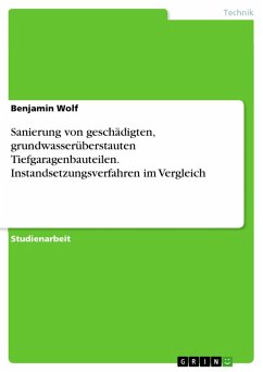 Studienarbeit aus dem Jahr 2012 im Fachbereich Ingenieurwissenschaften - Bauingenieurwesen, Note: 1,0, , Sprache: Deutsch, Abstract: Bestehende Bauwerke weisen oft Schadensbilder auf, die auf Schwachstellen an der Abdichtung zurückzuführen sind. Das betrifft insbesondere vom Grundwasser überstaute Bauteile. Dazu kann eine Vielzahl von Tiefgaragen gezählt werden, wo das Abdichtungskonzept aus der Bauzeit mangels Bestandsdokumentation oft nur unzureichend bekannt ist. Die Konstruktion und das Schadensausmaß haben Einfluss auf das Instandsetzungskonzept, das auf Grundlage einer detaillierten Bestandsaufnahme festgelegt wird. Typische Schadensmechanismen an Stahlbetonbauwerken mit schwarzer und weißer Wanne werden beschrieben und Möglichkeiten der lokalen Sanierung charakterisiert. Schwerpunkt bilden die verschiedenen Maßnahmen zur Abdichtung von Rissen und Fugen sowie Verfahren der Injektion und Vergelung. Darüber hinaus werden Möglichkeiten der nachträglichen flächigen Abdichtung charakterisiert und gegenübergestellt.