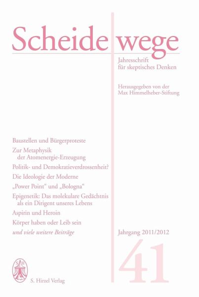Hier melden sich Autorinnen und Autoren zu Wort, für die Überkommenes ebenso fragwürdig ist wie maßlose Fortschrittsgläubigkeit. Die hochwertigen Bände, herausgegeben von der Max Himmelheber - Stiftung, stehen für eine Kultur des hoffnungsvollen Zweifelns quer gegen alle Konventionen. SCHEIDEWEGE erscheint einmal im Jahr.