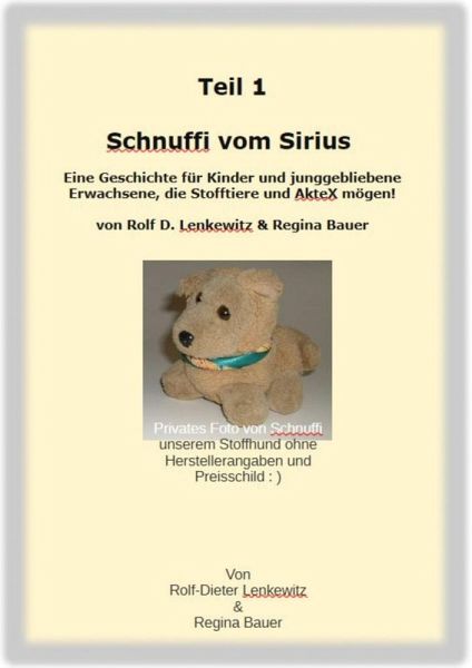 Der Sirianer: Eines Tages nämlich, aus heiterem Himmel, so ganz ohne Vorwarnung, als Rolf und Regina gerade in der Nähe des Bücherregals standen ertönte plötzlich laut und deutlich eine Stimme: "Ich bin der Schnuffi und komme vom Planeten Sirius, ich grüße Euch." Und mit diesen Worten sprang das kleine, inzwischen leicht eingestaubte Stofftier, ganz oben vom Bücherregal herab und landete direkt vor den Füssen von Rolf und Regina. Die beiden wurden käsebleich, schnappten nach Luft, sie mussten sich an der Wand anlehnen, denn der Erdboden unter ihren Füßen begann zu wanken, ein Stofftier das lebendig ist und spricht! Seit meiner Zeit hier unter euch habe ich regelmäßig dem Hohen Rat über euer Tun Bericht erstattet, bis beschlossen wurde, dass der Zeitpunkt für eine Offenbarung meinerseits jetzt gekommen ist," fuhr der Kleine eifrig fort. "So so was du nicht sagst, dürfen wir dann auch erfahren, auf welche Art und Weise du diesen Hohen Rat besuchst, der Sirius ist doch total weit weg. Wo hast du denn dein Raumschiff geparkt, hast du das im Keller versteckt oder ist es etwa für uns unsichtbar?"