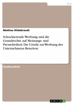Studienarbeit aus dem Jahr 2002 im Fachbereich Jura - Öffentliches Recht / Staatsrecht / Grundrechte, Note: 1,7 entspricht 14 Punkte Jura, Fachhochschule Kiel (Master of Business Law), Veranstaltung: Seminar an der FH Kiel zum Studiengang Master of Business Law, Sprache: Deutsch, Abstract: Die Werbung mit schockierenden Bildern wurde in den 1990er Jahren insbesondere durch den Kleidungshersteller Benetton in der deutschen Werbelandschaft etabliert. Zwar konnte sich dieser Typ Werbung nicht als all gemeingültiges Mittel durchsetzen. Jedoch findet sich immer wieder Werbung mit schockierenden Inhalten wie die HIV-Kampagne der Michael-Stich-Stiftung, die entsprechende Aufmerksamkeit erzielt. Ob diese Werbung in jedem Fall ihren angestrebten Zweck erfüllt mag dahinstehen. Die vorliegende Arbeit befasst sich mit den Urteilen des Bundesverfassungsgerichts (BVerfG) und des Bundesgerichtshofs (BGH), welche sich mit der rechtlichen Beurteilung der Werbung mit schockierenden Inhalten von Benetton befassen. Dabei wird das Spannungsfeld zwischen den Grundrechten und dem Wettbewerbsrecht aufgezeigt. Die Arbeit macht den Einfluss der Grundrechte und des BVerfG, als Hüterin der Grundrechte, auf das einfache Recht deutlich. Es wird zunächst die Gruppe der schockierenden Werbung in die Systematik des § 1 UWG eingefaßt und anschließend dieser Begriff näher betrachtet. Es folgt eine umfassende Darstellung der beiden Verfahren und der Argumente der entscheidenden Gerichte. Abschließend wird zum Thema Stellung genommen.