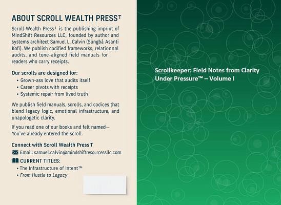 Scrollkeeper: Field Notes from Clarity Under Pressure(TM) is not a memoir. It is a codemarked witness codex. Volume I of the Scrollkeeper Public Codex Series, this collection by Súngbá Asanti Kofi preserves 14 rhythm-bound scrolls documenting emotional infrastructure, misrecognition recovery, and structural redress. Each scroll functions as a tone-anchored field entry, balancing ache, dignity, and refusal under institutional distortion. Blending legal theory, diasporic memory, and system audit tools, Kofi renders what the system tried to flatten: clarity under pressure. This codex is a tool for dignity recovery and structural literacy. It offers not just reflection but jurisdictional documentation of ache under systems of misrecognition. Published