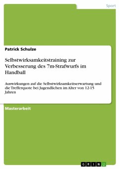 Masterarbeit aus dem Jahr 2020 im Fachbereich Sport - Sportpsychologie, Note: 1,7, Technische Universität Kaiserslautern, Sprache: Deutsch, Abstract: Ziel der vorliegenden Untersuchung war die Überprüfung der Wirksamkeit von Selbstwirksamkeitstraining auf die Trefferquote beim 7m-Strafwurf (Handball) und die Selbstwirksamkeitserwartung von Kindern und Jugendlichen im Alter zwischen 12 und 15 Jahren. Zudem wurde der Zusammenhang zwischen Selbstwirksamkeitserwartung und sportlicher Leistung im Kontext dieser Studie näher betrachtet. Zur Überprüfung der Trefferquote wurden zehn 7m-Würfe zu zwei Messzeitpunkten ausgeführt. Zwischen den Messzeitpunkten lag eine dreiwöchige Trainingsphase (Experimentalgruppe [N=32] ¿ praktisches Training + Selbstwirksamkeitstraining; Kontrollgruppe [N=32] ¿ praktisches Training). Das Konstrukt der Selbstwirksamkeit wurde durch die Trefferprognose und einen für diese Studie entwickelten Fragebogen (vier Items) wiederum zu zwei Messzeitpunkten erhoben. Die Entwicklung zwischen erstem Messzeitpunkt (Pre-Test) und zweitem Messzeitpunkt (Post-Test) und die Unterschiede zwischen den Untersuchungsgruppen wurden anschließend analysiert und nach Methoden der deskriptiven Statistik dargestellt. Zur Überprüfung der Studienergebnisse wurde eine zweifaktorielle Varianzanalyse mit Messwiederholung durchgeführt, die zeigte, dass lediglich bezüglich einer der sechs erhobenen Variablen ("SWKE-1") ein signifikanter Unterschied zwischen den Untersuchungsgruppen festgestellt werden konnte. Die Wirksamkeit des Selbstwirksamkeitstrainings konnte statistisch nicht nachgewiesen werden. Eine zusätzliche Korrelationsanalyse zeigte einen signifikanten Zusammenhang zwischen dem Konstrukt der Selbstwirksamkeit und der sportlichen Leistung (Trefferquote) der Probanden. Anhand dieser Analyse konnten vergleichbare Befunde der aktuellen Forschung bestätigt werden. Das Untersuchungsdesign wurde abschließend kritisch hinterfragt. Handball ist als Sport bekannt, bei der zwei Mannschaften mit je sieben Spielern (sechs Feldspieler und ein Torwart) gegeneinander antreten und in 60 Minuten Spielzeit oft über 50 Tore insgesamt in einem Spiel fallen können. Meistens sind die Ergebnisse sehr knapp und eine Mannschaft kann sich mit einem kleinen Vorsprung im direkten Duell mit dem Gegner durchsetzen. Durchschnittlich zeigt sich in der "LIQUI MOLY Handball-Bundesliga", bezogen auf die bisherige Saison 2019/2020, dass mehr als die Hälfte aller Spiele mit einer Differenz von drei Toren oder weniger gewonnen beziehungsweise verloren werden.