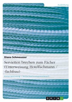 Unterweisung / Unterweisungsentwurf aus dem Jahr 2007 im Fachbereich AdA Gastronomie / Hotellerie / Tourismus, Note: 1, , Sprache: Deutsch, Abstract: Der Auszubildende soll nach der Unterweisung in der Lage sein, selbständig unter Berücksichtigung hygienischer Vorraussetzungen eine Mundserviette in die Form "Fächer" zu brechen und aufzustellen.