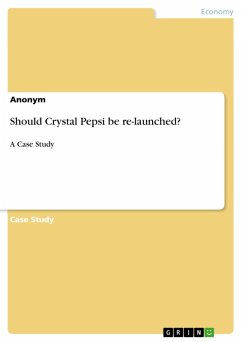 Case Study from the year 2017 in the subject Business economics - Offline Marketing and Online Marketing, grade: 1,7, , language: English, abstract: Crystal Pepsi was a clear Cola launched by PepsiCo in the early 1990s, following a marketing trend for clear and pure products. However, after an initial success, sales dropped drastically and the product was pulled off the market. Since then, a lot of factors like consumer preferences and the market environment have changed. The case focuses on the decision of whether Crystal Pepsi should be re-launched today or not. David Novak became CEO of PepsiCo North America in 1992 after a successful career in the marketing world. When he detected the development of pure and clear products' fad, ranging from soap to gasoline, he saw an opportunity to tap into for Pepsi. Thus, he decided to develop his idea and launch Crystal Pepsi, a colorless and caffeine-free cola that would appear more refreshing. By 1994, the trend was largely over and many of the products, including Crystal Pepsi, disappeared from the market due to poor sales. Only years later, precisely in 2007, during an interview, Novak admitted to Fast Company that while it was the "best idea" he ever had, it was also the "worst executed". If this buzz is true and is really happening, why Crystal Pepsi failed in the first place?