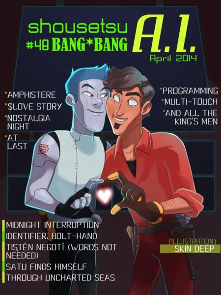 Shousetsu Bang*Bang issue 48 was released on April 21, 2014. The theme was AI. Shousetsu Bang*Bang is a webzine for original gay fiction/boy's love oneshot stories. This issue contains stories of romance between men which are between 1500 and 25,000 words and include explicit male-male sexual content. The issue contains the following stories: Programming, by Hyakunichisou 13 Midnight Interruption, by Shiawasena Ryoko-sha And All the King's Men, by shukyou Through Uncharted Seas, by Aosora Hikaru Nostalgia Night, by Phun Saa Amphistere, by Koiwa Shishiko At Last, by Midorin Multi-Touch, by Domashita Romero Identifier, Bolt-hand, by docktonroad Tistên Negotî (Words Not Needed), by Natsumachi Satu Finds Himself, by qui-te $LoveStory, by Himawari The issue also contains the following standalone art: Skin Deep, by Iron Eater