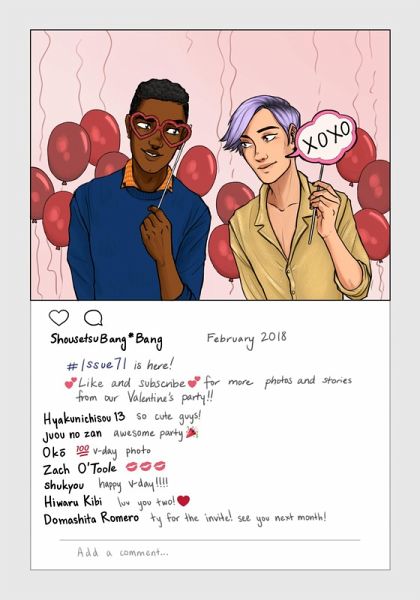 Shousetsu Bang*Bang issue 71 was released on February 26, 2018. The theme is Like and Subscribe. Shousetsu Bang*Bang is a webzine for original gay fiction/boy's love oneshot stories. This issue contains stories of romance between men which are between 1500 and 25,000 words and include explicit male-male sexual content. Find out more at http://www.shousetsubangbang.com/wiki/index.php?title=Issue_71 This issue contains the following stories: What happens next may surprise you, by Hyakunichisou 13 Premium Content, by Domashita Romero Suicide Prevention, by juou no zan Show-Off, by Hiwaru Kibi The Secret Between His Teeth, by Oko For the Vine, by shukyou Diplomatic Relations, by Zach O'Toole This issue also contains the following standalone art: Maintenance Window, by Iron Eater For his steady arms, by beili