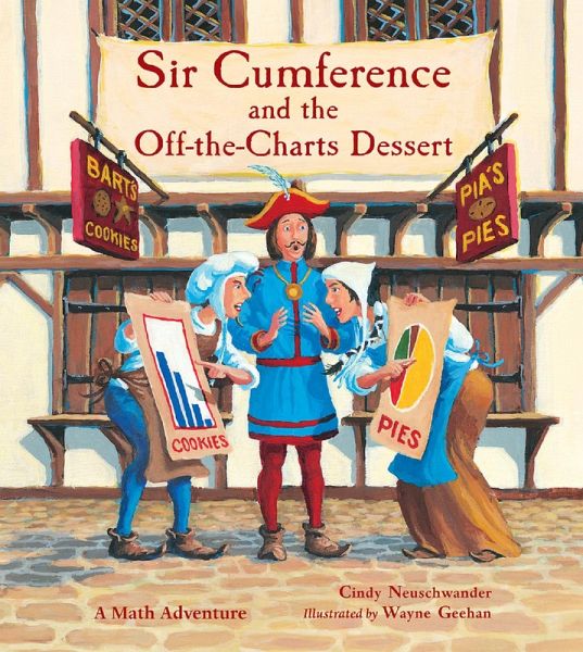 Join Sir Cumference and the gang for more wordplay, puns, and problem solving in the clever math adventure that introduces readers to charts and graphs through an annual bake-off. Sir Cumference and Lady Di need a baker to prepare a special dessert for the annual Harvest Faire. Two bakers compete to see whose dessert is most popular. When Pia of Chartres and Bart Graf have trouble keeping track of the votes their desserts receive, they each develop a better system. Pia places a colored candy around the edges of a pie dough (like a pie chart), and Bart stacks up cookie tins (making a 3D bar graph). When there's a tie, the two chefs cook up a hybrid dessert just in time for the Faire. Puns--both literal and visual--abound in this fun adventure story with beloved characters and a solid pedagogical foundation.
