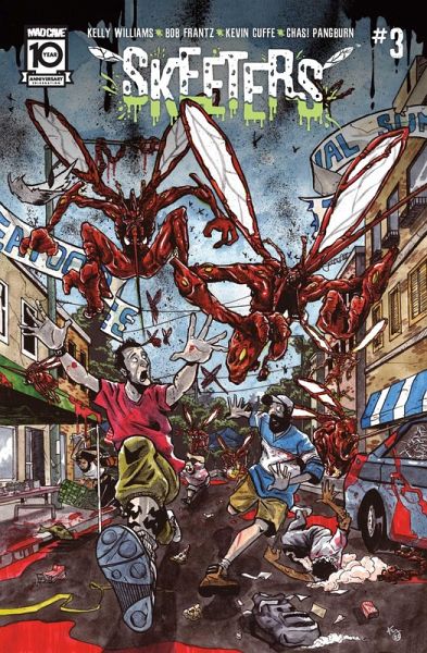 The buzz surrounding the Kankakee Seafood Festival isn't good: it's already swarming with creatures, gore, and alien goo. Carla and co. arrive with guns (and blunts) a-blazin' only to find matters can still get much, much worse. Skeeters is a comedic and gruesome story for fans of Slither, Arachnophobia, and other classic creature-features!
