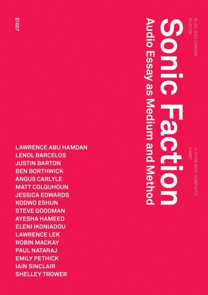 Explorations of the audio essay as medium and method. With contributors including Justin Barton, Angus Carlyle, Kodwo Eshun, Steve Goodman, Robin Mackay, Paul Nataraj, and Iain Sinclair, Sonic Faction presents extended lines of thought prompted by two Urbanomic events which explored the ways in which sound and voice can produce new sensory terrains and provoke speculative thought. Three recent pieces provide the catalyst for a discussion of the potential of the "audio essay" as medium and method, a machine for intensifying listening and unsettling the boundaries between existing forms: documentary, music, ambient sound, audiobook, field recording, radio play…. Kode9's Astro-Darien (2022) is a sonic fiction about simulation, presenting an alternative history of the Scottish Space Programme, haunted by the ghosts of the British Empire. Justin Barton and Mark Fisher's On Vanishing Land (2006) is a dreamlike account of a coastal walk that expands into questions of modernity, capitalism, fiction, and the micropolitics of escape. Robin Mackay's By the North Sea (2021) is a meditation on time, disappearance, and loss as heard through the fictions of Lovecraft, Ccru, and the spectre of Dunwich, the city that vanished beneath the waves. Alongside photographic documentation of the events and edited transcripts of the artists' discussions, Sonic Faction brings together contributors with diverse perspectives to address the question of the audio essay and to imagine its future. Contributors Lawrence Abu Hamdan, Lendl Barcelos, Justin Barton, Ben Borthwick, Angus Carlyle, Matt Colquhoun, Jessica Edwards, Kodwo Eshun, Steve Goodman, Ayesha Hameed, Eleni Ikoniadou, Lawrence Lek, Robin Mackay, Paul Nataraj, Emily Pethick, Iain Sinclair, Shelley Trower