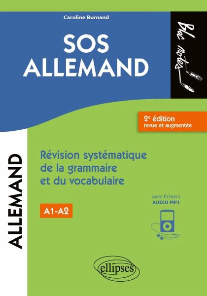 Les acteurs Vous êtes élève en collège ou lycée ? Vous voulez reprendre l'étude de l'allemand ? SOS Allemand est pour vous ! Vous trouverez dans ce bloc-notes l'essentiel de la grammaire et du vocabulaire à assimiler, sous formes de fiches illustrées. De nombreux exercices corrigés, associant parfois la compréhension orale et la production écrite. Vous pourrez ainsi vous entraîner et évaluer vos progrès en allemand. Le scénario . 35 fiches de révision grammaticale ; . 25 fiches de vocabulaire classées par thème ; . 113 exercices assortis d'une grille d'auto-évaluation dont 45 sur la base de fichiers audio ; . tous les corrigés et les transcriptions des fichiers audio ; . la liste des verbes irréguliers les plus courants. Le plus 45 fichiers audio à télécharger gratuitement sur le site des éditions Ellipses.