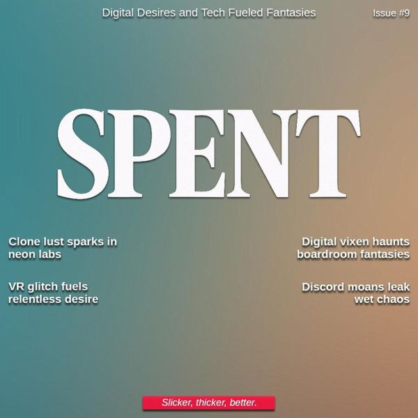 Spent Magazine's ninth issue dives deep into a neon-soaked world where technology fuels primal urges. From glitchy VR fuckfests to AI seductions that pull every string, these stories and shorts explore clones, voyeurism, and digital chaos that'll leave you buzzing. Perfect for men craving smart, filthy escapism that rewires the senses.