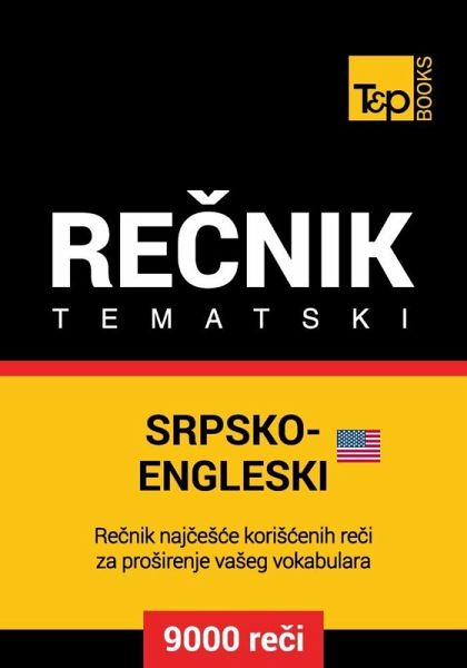 OVAJ TEMATSKI RECNIK JE NAMENJEN da vam pomogne da naucite, zapamtite i obnavljate strane reci. Recnik sadrzi preko 9000 najcesce koriscenih reci. Preporucuje se kao dodatna podrska bilo kom kursu jezika. Zadovoljava potrebe pocetnika i naprednih ucenika stranih jezika. Pogodan za svakodnevnu upotrebu, obnavljanje i samo-testiranje. Omogućava vam da procenite svoju trenutni fond reci. Ovu knjigu takode mogu koristiti i stranci za ucenje srpskog jezika. OVO IZMENJENO I DOPUNJENO IZDANJE sadrzi 256 tema, ukljucujući: osnovne pojmove, brojeve, jedinice merenja, najvaznije glagole, vreme, kalendar, dan i noć, mesece u godini, godisnja doba, putovanja, razgledanje, gradove, kupovinu, garberobu i aksesoari, kozmetiku, telefonske razgovore, strane jezike, jela, restorane, clanove porodice, ljudsko telo, medicinu, namestaj, belu tehniku, planetu zemlju, vremensku prognozu, prirodne katastrofe, faunu, divlje zivotinje, zemlje sveta i vise ... POSEBNE KARAKTERISTIKE dvojezicnih vokabulara T&P books: reci su rasporedene u skladu sa njihovim znacenjem, ne po abecednom redu. Sadrzaj je predstavljen u tri kolone da olaksa obnavljanje i samo-testiranje. Svaka tema se sastoji od malih blokova slicnih leksickih jedinica. Recnik nudi pogodnu i jednostavnu transkripciju za svaku stranu rec.