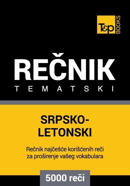OVAJ TEMATSKI RECNIK JE NAMENJEN da vam pomogne da naucite, zapamtite i obnavljate strane reci. Recnik sadrzi preko 5000 najcesce koriscenih reci. Preporucuje se kao dodatna podrska bilo kom kursu jezika. Zadovoljava potrebe pocetnika i naprednih ucenika stranih jezika. Pogodan za svakodnevnu upotrebu, obnavljanje i samo-testiranje. Omogućava vam da procenite svoju trenutni fond reci. Ovu knjigu takode mogu koristiti i stranci za ucenje srpskog jezika. OVO IZMENJENO I DOPUNJENO IZDANJE sadrzi 155 tema, ukljucujući: osnovne pojmove, brojeve, jedinice merenja, najvaznije glagole, vreme, kalendar, dan i noć, mesece u godini, godisnja doba, putovanja, razgledanje, gradove, kupovinu, garberobu i aksesoari, kozmetiku, telefonske razgovore, strane jezike, jela, restorane, clanove porodice, ljudsko telo, medicinu, namestaj, belu tehniku, planetu zemlju, vremensku prognozu, prirodne katastrofe, faunu, divlje zivotinje, zemlje sveta i vise ... POSEBNE KARAKTERISTIKE dvojezicnih vokabulara T&P books: reci su rasporedene u skladu sa njihovim znacenjem, ne po abecednom redu. Sadrzaj je predstavljen u tri kolone da olaksa obnavljanje i samo-testiranje. Svaka tema se sastoji od malih blokova slicnih leksickih jedinica. Recnik nudi pogodnu i jednostavnu transkripciju za svaku stranu rec.