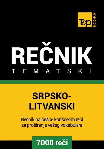OVAJ TEMATSKI RECNIK JE NAMENJEN da vam pomogne da naucite, zapamtite i obnavljate strane reci. Recnik sadrzi preko 7000 najcesce koriscenih reci. Preporucuje se kao dodatna podrska bilo kom kursu jezika. Zadovoljava potrebe pocetnika i naprednih ucenika stranih jezika. Pogodan za svakodnevnu upotrebu, obnavljanje i samo-testiranje. Omogućava vam da procenite svoju trenutni fond reci. Ovu knjigu takode mogu koristiti i stranci za ucenje srpskog jezika. OVO IZMENJENO I DOPUNJENO IZDANJE sadrzi 198 tema, ukljucujući: osnovne pojmove, brojeve, jedinice merenja, najvaznije glagole, vreme, kalendar, dan i noć, mesece u godini, godisnja doba, putovanja, razgledanje, gradove, kupovinu, garberobu i aksesoari, kozmetiku, telefonske razgovore, strane jezike, jela, restorane, clanove porodice, ljudsko telo, medicinu, namestaj, belu tehniku, planetu zemlju, vremensku prognozu, prirodne katastrofe, faunu, divlje zivotinje, zemlje sveta i vise ... POSEBNE KARAKTERISTIKE dvojezicnih vokabulara T&P books: reci su rasporedene u skladu sa njihovim znacenjem, ne po abecednom redu. Sadrzaj je predstavljen u tri kolone da olaksa obnavljanje i samo-testiranje. Svaka tema se sastoji od malih blokova slicnih leksickih jedinica. Recnik nudi pogodnu i jednostavnu transkripciju za svaku stranu rec.