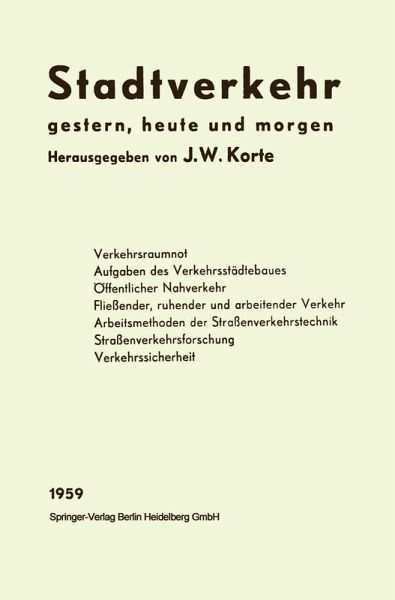 Einführung.- Begrüßungsworte zur Tagung "Stadtverkehr gestern, heule und morgen" in Essen am 28. 3. 1957.- I. Stadt und Stadtverkehr.- II. Die Stadtentwicklung aus der Warte des Verkehrs.- III. Organisation des städtischen Gesamtverkehrs.- IV. Der öffentliche Nahverkehr in den Innenräumen unserer Städte.- V. Berechnung und Ausgestaltung der Straßenverkehrsanlagen in der Stadt.- VI. Anlagen für den ruhenden Kraftverkehr.- VII. Straßenverkehrsforschung.- VIII. Die Sicherung des Stadtstraßenverkehrs.- Schlußwort.