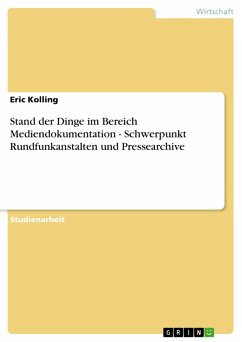 Studienarbeit aus dem Jahr 2002 im Fachbereich Informationswissenschaften, Informationsmanagement, Note: 1.3, Universität des Saarlandes (FR 5.6. Informationswissenschaft), Veranstaltung: Methoden und Verfahrensweisen praktischer Information und Dokumentation, Sprache: Deutsch, Abstract: Zur Einleitung klärt diese Arbeit zunächst den Begriff "Archiv" bevor sie sich dann mit den Fragen beschäftigt, wer Medienarchive unterhält und was ihre konkreten Funktionen sind. Der Schwerpunkt liegt auf denjenigen Archiven, die von Medienunternehmen wie Verlagen oder Rundfunkanstalten unterhalten werden. Im Anschluss folgt eine Diskussion, wo es bei der bisherigen Archivierung von Audio-, audiovisuellen und schriftlichen Medien Probleme gab. Im folgenden Kapitel werden die Lösungsansätze für diese Probleme näher erläutert. Zunächst werden einige Lösungsansätze für die physische Lagerung der Produkte genannt, dann liegt ein besonderer Schwerpunkt auf der "Digitalisierung" der Bestände. Neben den Vorteilen die diese Digitalisierung mit sich bringt, ergeben sich auch Nachteile und Probleme rechtlicher Natur. Vor allem ändert sich durch die Technisierung allgemein auch die Arbeitsweise von Mediendokumentaren, was im fünften Kapitel gezeigt werden soll. Daran anschließend wird ein Überblick über den aktuellen Stand der Technik in Deutschland gegeben. Dies sowohl für Videoarchive als auch für Ton- und Pressearchive. Unter Punkt 7) werden die aktuellen elektronischen Archivierungsmodelle von CNN und ZDF. Eine Zusammenfassung bzw. ein Ausblick in die Zukunft runden die Arbeit ab.