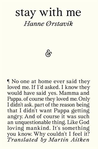 The narrator of this novel is a Norwegian writer living in Milan. A year has passed since the premature death of her Italian husband. She falls in love. M is fifteen years younger than her, but the connection between them is intense and of a kind she has never felt before. Then, as his vulnerability starts showing, so does his troubling rage. She knows this rage. It was always present in her childhood, and it created an all-encompassing fear in her. In Stay with Me, Hanne Ørstavik returns to her theme of love, this time exploring how it can be intertwined with insecurity, fear and violence. How do you recognize love? What if your deeply rooted need to protect yourself also means shutting love out?