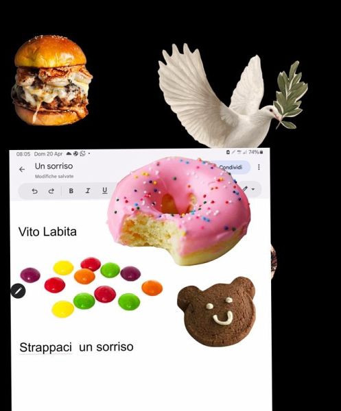 Conclusione "Strappaci un sorriso" è una poesia che vive di ritmo, immaginazione e nonsense. Con stile fresco e creativo, Vito Labita invita il lettore a lasciarsi andare all'assurdo, a trovare nel gioco delle parole un rifugio e forse anche una piccola verità: che la poesia non deve sempre spiegare, ma può semplicemente far sorridere. ........ ......