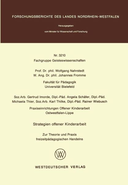 I. Einleitung.- 1. Offene Kinderarbeit als ein neues freizeitpädagogisches Handlungsfeld.- 2 Qualifizierung offener Kinderarbeit als erziehungswissenschaftliche Aufgabe.- 3 Ziel und Struktur des Forschungsvorhabens.- 4 Komplexer pädagogischer Handlungsbegriff als (theoretisches) Ergebnis.- 5 Ein Beitrag zur Handlungsforschung als (erziehungswissenschaftliche) Innovationsforschung.- 6. Aufbau des Berichts.- 7. Dank.- II. Lage der Kinder.- 1. Kennzeichen.- 2. Geschichte der Kindheit.- 3. Kinder als kleine Erwachsene.- 4. Die Entstehung der Kindheit.- 5. Kindheit heute.- 6. Notwendigkeit einer Freizeitpädagogik.- III. Offene Kinderarbeit.- 1. Von der Kindererziehung zur offenen Kinderarbeit.- 2. Offene Arbeit mit Kindern.- 3. Ziele offener Kinderarbeit.- IV. Handlungsfelder.- 1. Allgemeine Kennzeichen.- 2. Einrichtungen offener Kinderarbeit.- 3. Am Forschungsvorhaben beteiligte Einrichtungen.- V. Handlungsforschung.- 1. Handlungsforschung allgemein.- 2. "Strategien offener Kinderarbeit" als Handlungsforschungprojekt.- VI. Strategien offener Kinderarbeit.- a) Pädagogisches Handeln.- b) Pädagogische Strategie und System.- c) Freizeitpädagogik als pädagogische Strategie in offenen Situationen.- d) Strategiekonzepte für offene Kinderarbeit.- VII. Strategien in unterschiedlichen Einrichtungen offener Kinderarbeit.- 1. Strategien offener Kinderarbeit auf dem Aktivspielplatz.- 2. Strategien offener Kinderarbeit auf der Jugendfarm.- 3. Strategien offener Kinderarbeit im Haus der offenen Tür.- 4. Strategien offener Kinderarbeit beim Spielmobil.- 5. Strategien offener Kinderarbeit im Jugendamt.- 6. Zusammenfassung.- VIII. "Die Drachen kommen" Beispielprojekt zu Strategien offener Kinderarbeit.- 1. Begründung.- 2. Konzeption.- 3. Didaktische Realisierung in derVorlaufphase.- 4. Didaktische Realisierung.- 5. Analyse der Strategien offener Kinderarbeit beim Drachenfest auf der Sparrenburq.- 6. Dokumente zum Drachenfest.- 1. Zeitungsausschnitte zum Forschungsvorhaben.- 2. Zeitungsausschnitte zu Drachenfest und Ferienspielen.- 3. Literaturverzeichnis.