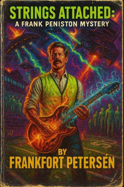 From Frankfort Petersén, Book 16 of the Frank Peniston Mysteries cranks the absurd noir satire to eleven: a pulp-thriller parody where guitars are weapons, gadgets run on duct tape and spite, and the truth always plays out of tune.