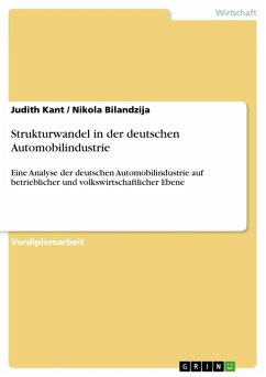Vordiplomarbeit aus dem Jahr 2007 im Fachbereich BWL - Wirtschaftspolitik, Note: 1,0, Fachhochschule für Wirtschaft Berlin, Sprache: Deutsch, Abstract: Die Automobilindustrie unterliegt weltweit einem Wandel. Stagnierenden Absätze in den reifen Märkten der Triade (Japan, USA, Europa) zwingen die gesamte Industrie sich immer wieder neu strategisch zu orientieren. Des Weiteren erfordert der wachsende Kosten- und Konkurrenzdruck sich sicher zu positionieren und neue Kooperationsformen zu entwickeln. Diese Veränderungen konnten in den letzten Jahrzehnten anhand der Entwicklung vom Taylorismus und Arbeitsteilung über Lean Management und Business Reeingeneering und anderen neuen Strategien beobachtet werden. Die Globalisierung und Liberalisierung von Handelshemmnissen geben weitere Impulse zur konkurrenzfähigen Umstrukturierung der Abläufe an traditionellen Produktionsstandorten wie Deutschland. In dieser Arbeit werden deshalb die aktuellen sowie prognostizierten Strukturveränderungen aufgezeigt; es wird untersucht, wie sich die deutsche Automobilindustrie gegenüber der globalen Konkurrenz behaupten kann. Es soll erörtert werden, ob sich der globale Druck auf die Beschäftigungslage in Deutschland auch auf die Binnennachfrage nach Automobilen in der deutschen Volkswirtschaft ausgewirkt hat. In Deutschland selbst ist die Automobilindustrie mit einem Anteil von 19 % am Gesamtumsatz der deutschen Industrie der wichtigste Wirtschaftszweig. Laut dem VDA ist sogar jeder siebente Arbeitsplatz in Deutschland direkt oder indirekt mit der Automobilindustrie verbunden. Aus diesem Grund soll außerdem gezeigt werden, ob und wie die Beschäftigung am Standort Deutschland gesichert ist und wie die stetigen strukturellen Veränderungen in der Beschäftigungslage wiedergespiegelt werden.