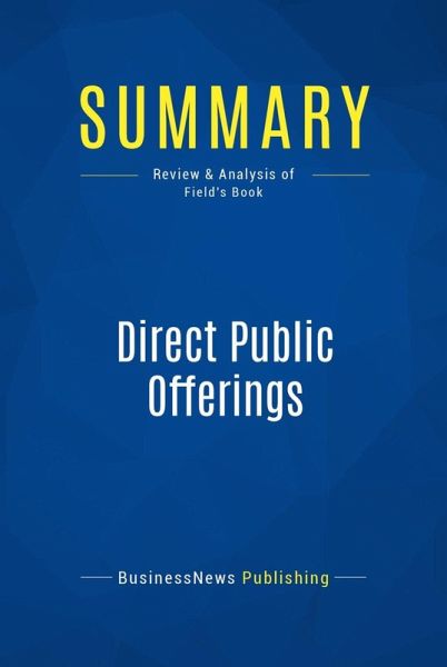 This complete summary of the ideas from Drew Field's book "Direct Public Offerings" explains how DPOs have now become a viable way for companies to sell stock directly to the public, without the expenses required for traditional IPO processes. In his book, Drew Field shows how Direct Public Offerings deliver significant advantages and opportunities for both investors and companies. By reading the information provided by the author, you will understand what DPOs can do for you and your business, and start making them an integral part of your business plan.