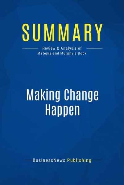 This complete summary of the ideas from Ken Matejka and Al Murphy's book "Making Change Happen" shows that there is no one method that can always be used to implement change within an organisation, as there are too many variables involved. In their book, the authors have devised a systematic process for increasing your company's chances of success when trying to implement change. This summary explains the entire process in detail, making it easy for you to learn it and apply it to your own business.