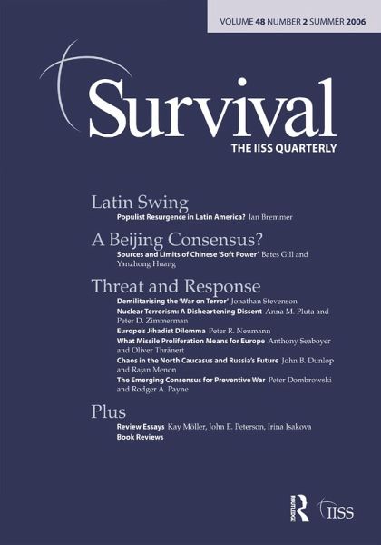 First published in 2006. This Issue of 'Survival' Volume 48, Number 2, Summer 2006 includes articles that pose the question of Populist resurgence in Latin America, Sources and Limits of Chinese 'soft power'; demilitarising the 'War on Terror', nuclear terrorism; Europe's Jihadist dilemma; chaos in North Caucasus and Russia's future; and the emerging consensus for preventive war.