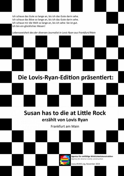 Was erwartet Sie? Ein Lesebuch leidenschaftlicher Bilder vielfältiger Identitäten! --- Als Mörderin sterben zu müssen fühlt sich grausam an. Für alle Beteiligten. Susan, junge Bürgerin des Staates Arkansas, trifft ihr Schicksal. Sie hat versäumt, die vielfältigen Folgen ihres Verbrechens vorherzusehen. --- Was macht das mit den Menschen? Lovis Ryan, nichtbinär-diverse Journalist:in aus Frankfurt am Main, schaut genau hin. Der US-Staat will würdevoll mit den Menschen umgehen. Auch wenn er die Regel "Du sollst nicht töten" bricht, um Männer und Frauen vom Morden abzuhalten. --- Wie kann das geschehen? Ein Dilemma? In unserer Welt? Die fiktive Autorenfigur schlüpft empathisch in Motive, Gedanken und Gefühle der Handelnden. Lovis Diversität wird zur Kraft, Ursachen des grausamen Geschehens zu ergründen. Was lernen wir daraus? --- Wie immer, teilt Lovis seine Empfindungen beim Schreiben mit den Lesenden. Die Erzählung des Kriminalfalls geht unter die Haut. Sie zeichnet die Figuren in menschlicher Ernsthaftigkeit. In großer Schönheit. Sehr achtsam. --- Sind Sie für die Todesstrafe? Oder dagegen? Lovis beunruhigende Gedanken verführen, noch einmal nachzudenken: Wie kann eine strenge, gerechte und achtsame Demokratie Individuen, die grenzüberschreitende Neigungen menschenfeindlich ausleben, wirksam bestrafen?