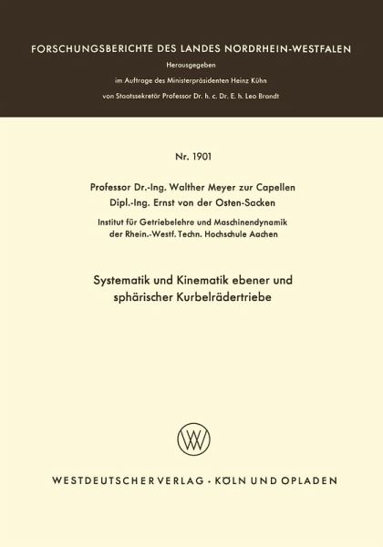I: Ebene Kurbelrädertriebe.- 1. Systematik und Maßbeziehungen.- 2. Abtriebsbewegung.- 3. Sonderfälle der Grundgetriebe.- II: Sphärische Getriebe.- 1. Allgemeiner Grundgedanke.- 2. Der sphärische Umlaufrädertrieb.- 3. Anwendung auf den Kurbelrädertrieb.- 4. Übergang vom sphärischen Getriebe zum ebenen durch Grenzübergang.- 5. Stillstände im Abtrieb.- Abbildungen.- ALGOL-Programm.