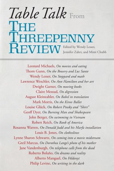 Table Talk is a portable dinner party and a book to read alone while laughing out loud. Table Talk is a salon attended by your smartest friends and by all of the wittiest people they know. Table Talk is a collection of brief but critically acclaimed, half serious/half tongueincheek pieces that borrow the format of The New Yorker's "Talk of the Town" column. Selected from several decades of The Threepenny Review, known colloquially as the West Coast's New York Review of Books, these anecdotal essays debate the historical, artistic, and technological developments of our time. Released to coincide with the 35th anniversary of The Threepenny Review in January 2015, Table Talk, edited by Wendy Lesser, Mimi Chubb and Jennifer Zahrt, includes essays by Christopher Ricks, who unfolds a dazzling literary history of the phrase "Table Talk"; Leonard Michaels on why the waltz should be viewed as an aggressive, imperialist dance; and Claire Messud on the art of digression in fiction and conversation. Sigrid Nunez engages with the contemporary vogue for memoir and autobiography, while Luc Sante draws conclusions about postmodern art from a stray bit of graffiti glimpsed on a New York street. Other contributions include Alexander Nehamas on the NEA controversy that roiled the culture wars of the 1990s and Paula Fox's tips for interacting with difficult children. Ninetynine pieces become a garden of literary delights, as Table Talk takes an irreverent walk on the wild side of philosophical and cultural speculation that will resonate with readers of any age.