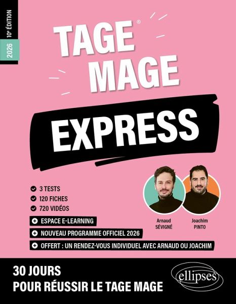 OBJECTIF : Avoir une préparation complète (de A à Z) au TAGE MAGE pour viser les meilleurs scores. LES NOUVEAUTÉS : - Un rendez-vous individuel offert avec Joachim Pinto & Arnaud Sévigné - 10 nouvelles astuces de calcul. - Une remise à niveau mathématiques mise à jour. LES + SUR LE FOND : - 3 tests blancs. - 120 fiches de cours + 120 vidéos de cours. - 600 questions + 600 corrigés en vidéo. - 100 % des questions corrigées en vidéo. - Corrigés détaillés étape par étape. - 15 plannings de révision. - Espace E-LEARNING sur www.hello-tage-mage.com - Une entraide dans les communautés Facebook / Instagram / Twitter / Linkedin N°1 des candidats « Monsieur TAGE MAGE » et « Monsieur Ecoles de commerce » (+ de 50 000 membres). - Chaîne Youtube N°1 en TAGE MAGE® (1 million de vues) - Concis, Clair, Complet = Pas de « blabla ». - Toutes les formules / astuces / conseils. LES + SUR LA FORME : - Ouvrage en couleur. - Auteurs 100 % disponibles par mail ou Facebook. - Fiches et questions classées par difficulté (1 à 5 étoiles). - Mise en page travaillée = Apprentissage accéléré.