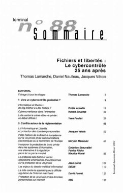 Au sommaire de cette revue : Editorial (Thomas Larmache), Vers un cybercontrole generalise ? (Emilie Armatte, Hubert Bouchet, Yves Poullet ), Conflits autour de la reglementation ( Jacques Vetois, Meryem Marzouki, Godefroy Beauvallet, Patrice Flichy, Maurice Ronai, Jean Gonie, DELIS, David Forest, IRIS ), Une tendance internationale ( Armin Murmann, Mariella Berra, Magda Talamo, Eva Simon ), Document et bibliographie ( Daniel Naulleau ).