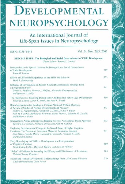 The Biological and Social Determinants of Child Development stimulates cross-disciplinary communication and research collaboration in the field of child development. While the papers in this issue seem diverse in terms of topic and discipline, there are a number of common themes: *critical period for brain development and the importance of specific environmental input during this period; *importance of early brain development and enriched environments is supported in articles describing findings from human studies; *potential for brain plasticity following specialized retraining is found in a compelling paper demonstrating different profiles of brain activation for normal readers vs. those who have dyslexia and younger children at high risk for development of reading disabilities; and *critical period, brain plasticity, and parallel changes in developing behavior and brain structure and functioning. As a number of papers in this issue describe potential interventions, one is relevant because it describes the numerous factors that make results of such studies have the potential to generalize to larger populations. Putting the described papers in a broad perspective, the last article argues that we cannot understand the health status of a society without understanding the health-determining influences across the life course.