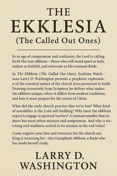 In The Ekklesia (The Called Out Ones), Larry D. Washington takes readers on a biblical journey from the first mention of the ekklesia in Matthew 16 to the victorious, overcoming Bride of Christ revealed in Revelation. This book exposes the difference between the true church and the counterfeit system rising in these last days and calls every believer to walk in holiness, obedience, and readiness for the return of Christ.