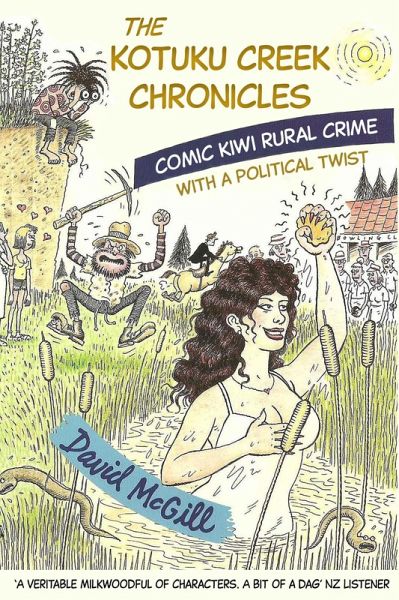 These three comic novels revolve around a gold strike in the local creek, the sudden appearance of a geyser and the theft of a valuable stamp, threatening damnation and salvation for the sleepy New Zealand coastal community of Kotuku. In the first chronicle the 1980s government restructuring has closed the post office, the petrol pumps and the railway station. Ex-postmaster Jack Cavanagh and struggling storekeeper Ron Atkinson are trying to unify the villagers and the retirement home snobs to save the last vestige of village life, the bowling club, target of property developer and drug pusher Bob Rogers. The gold-seekers overwhelming the village offer Bob further potential, but he goes too far when he tries to ransom Jack's daughter. A generation later an earthquake creates a massive geyser that inspires a tourist invasion and exploitation by Bob Rogers and government agencies, opposed by local Maori protecting their land. Jack Cavanagh just wants to find his missing grandson Jason and friend the ex-stationmaster Rangi Rangihau. A mistreated, pie-pilfering Great Dane is Jack's best chance, if he can entice it out of hiding. The final chronicle set in 1949 has a swarm of fortune hunters looking for a missing and very valuable Kotuku stamp, including the young Bob Rogers and other unscrupulous criminals employing arson, intimidation and the kidnapping of Jack Cavanagh's son in pursuit of the stamp. The chronicles depict villagers defending their peaceful lifestyle against threats from outside exploiters, a parable perhaps for the resilience of ordinary Kiwi blokes and fiery females.