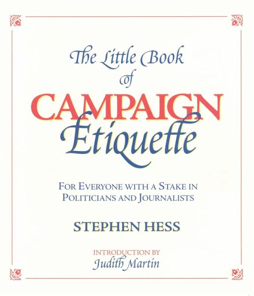 ""Some people think that etiquette is fine for tea parties, but there's no room for it when important political business has to be done,"" writes Miss Manners, otherwise known as Judith Martin. ""That's not true. The more controversy you have, the more etiquette you need. You need rules and order."" The missing ingredient in efforts to improve campaign discourse is a set of agreed-upon norms and standards for behavior. In this shrewd and amusing series of observations, Stephen Hess provides a political etiquette for campaign behavior on the part of both politicians and journalists. Organized alphabetically under such headings as Advertising, Bias, Cyberpolitics, Disclosure, Families, Lying, Money, Sex Scandals, and Talk Radio, forty-three brief essays examine common practices and places where the system breaks down, then recommend preventive or corrective action through a few clear rules. After discussing the paucity of local television reporting on local and state political campaigns, for example, Hess comments, ""the etiquette for local news directors is to ask, 'If we are not reporting local elections, who will?' Then act accordingly."" With its broad coverage of campaign-related topics and its sensible suggestions, this book provides a useful corrective for practices that are dishonest, downright illegal, or sometimes just endlessly irksome. The book features illustrations by some of America's foremost political cartoonists, including Herblock, Jim Borgman, Walt Handelsman, Mike Peters, Wayne Stayskal, and Garry Trudeau.