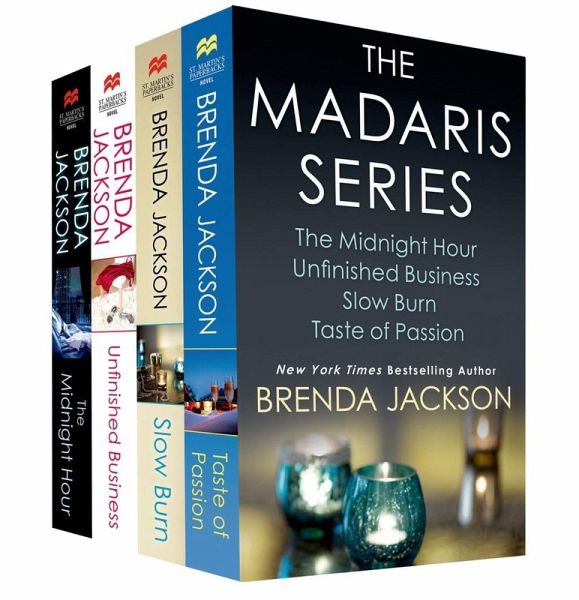 Dive headfirst into the burning passion and sizzling longing of the Madaris Family series from New York Times bestselling author Brenda Jackson. The Madaris Series bundle contains The Midnight Hour, Unfinished Business, Slow Burn, and Taste of Passion. The Midnight Hour CIA agent Drake Warren gave his heart to a woman-a fellow Marine whose death in an explosion left him aching, and Drake vowed he would never love again. But his devotion to his former lover is tested when he meets his mysterious new partner, Agent Victoria Green. Victoria leaves Drake yearning for the love he lost-and left in the dark that she was the Marine who was in an explosion that nearly killed her. Her life-saving surgery gave her a new face and identity-but just as the passion she's denied for so long threatens to boil over, Drake begins to put together the pieces of the puzzle. And when he does, will Victoria lose him forever? Unfinished Business Investigative reporter Christy Madaris doesn't want to complicate her life with romance. She made that mistake once when she believed Alex Maxwell's promise to marry her. True, Alex made that promise when Christy was just a teenager. But she believed him with all her heart-and when Alex laughed it off years later, Christy was crushed. Slow Burn Everything in attorney Skye Barclay's life is fitting smoothly into place until she makes the startling discovery that she was adopted. Not only does she learn that her birth mother has died, but now Skye finds out that she has a biological brother: Vincent. Skye wants to track him down, and her parents support her. But her fiancé, Wayne, refuses to accept her decision...and abruptly ends their engagement. Skye's search for Vincent leads her to his adoptive parents, Dr. Justin and Lorren Madaris, and, lo and behold, Slade Madaris-Vincent's tall, dark, and sexy cousin. Slade is by far the most compelling man Skye has ever met, but she isn't ready to get involved so soon after Wayne's rejection...or is she? Taste of Passion Attorney Mackenzie "Mac" Standfield swore off love when her heart was shattered into a million pieces. But there's one man who has managed to tempt her beyond reason-rodeo star Luke Madaris. Although five years have passed, Mac discovers when she runs into Luke again that the sexual tension is just as charged as ever...