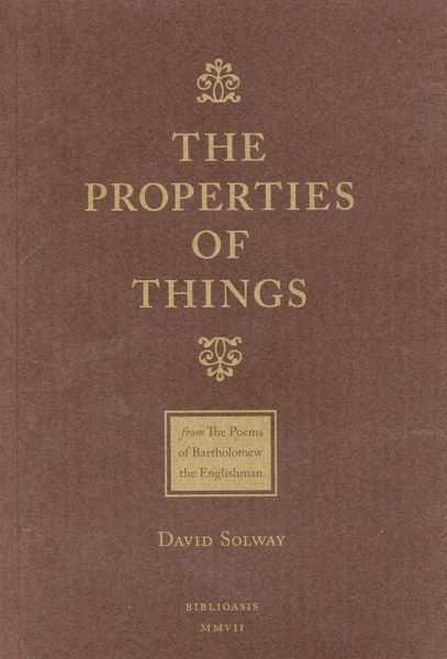 The Properties of Things continues David Solway's explorations in the realm of fictive translation, this time that of the obscure thirteenth century scholar Bartolomaeus Anglicus. The result is a poetic alphabetary, ranging from the bawdy to the sublime. David Solway has been called "an internationalist of the imagination." He remains one of the country's most brilliant and inventive poets.
