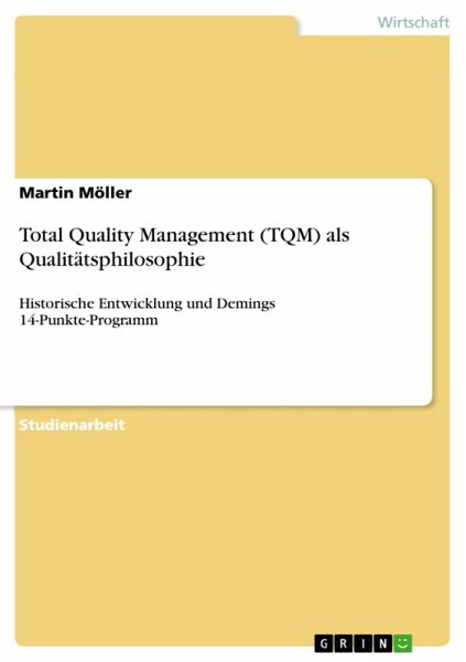 Studienarbeit aus dem Jahr 2009 im Fachbereich BWL - Unternehmensführung, Management, Organisation, Württembergische Verwaltungs- und Wirtschafts-Akademie e.V., Sprache: Deutsch, Abstract: Diese Arbeit dient als Einführung in das Thema: Total Quality Management als Qualitätsphilosophie. Dabei konzentriert sich die Arbeit darauf den größeren Rahmen, das Big Picture, dieses Themas darzustellen. Wie ist TQM entstanden, wieso gibt es TQM und was sind die Kernpunkte davon? Es wird vor allem die historische Entwicklung und das 14-Punkte-Programm von Deming erläutert, welches Kernpunkte des TQMs wiedergibt. Ich stelle diese Arbeit hier zur Verfügung, da ich selber Schwierigkeiten hatte eine Abhandlung des Themas in dieser Form zu finden. Adequate Quellen, die ich nach intensiver Recherche auffand und genutzt werden können, sind in der Arbeit selbstverständlich angeführt.